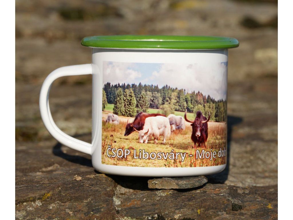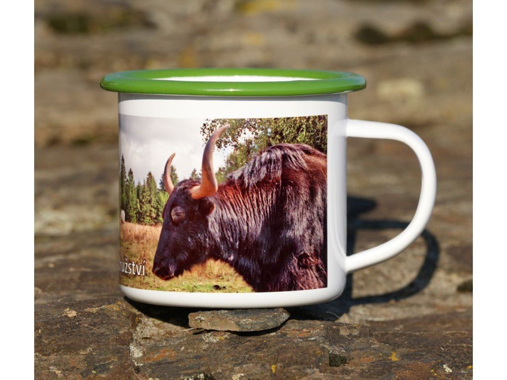 Bílý lesklý plechový hrnek.